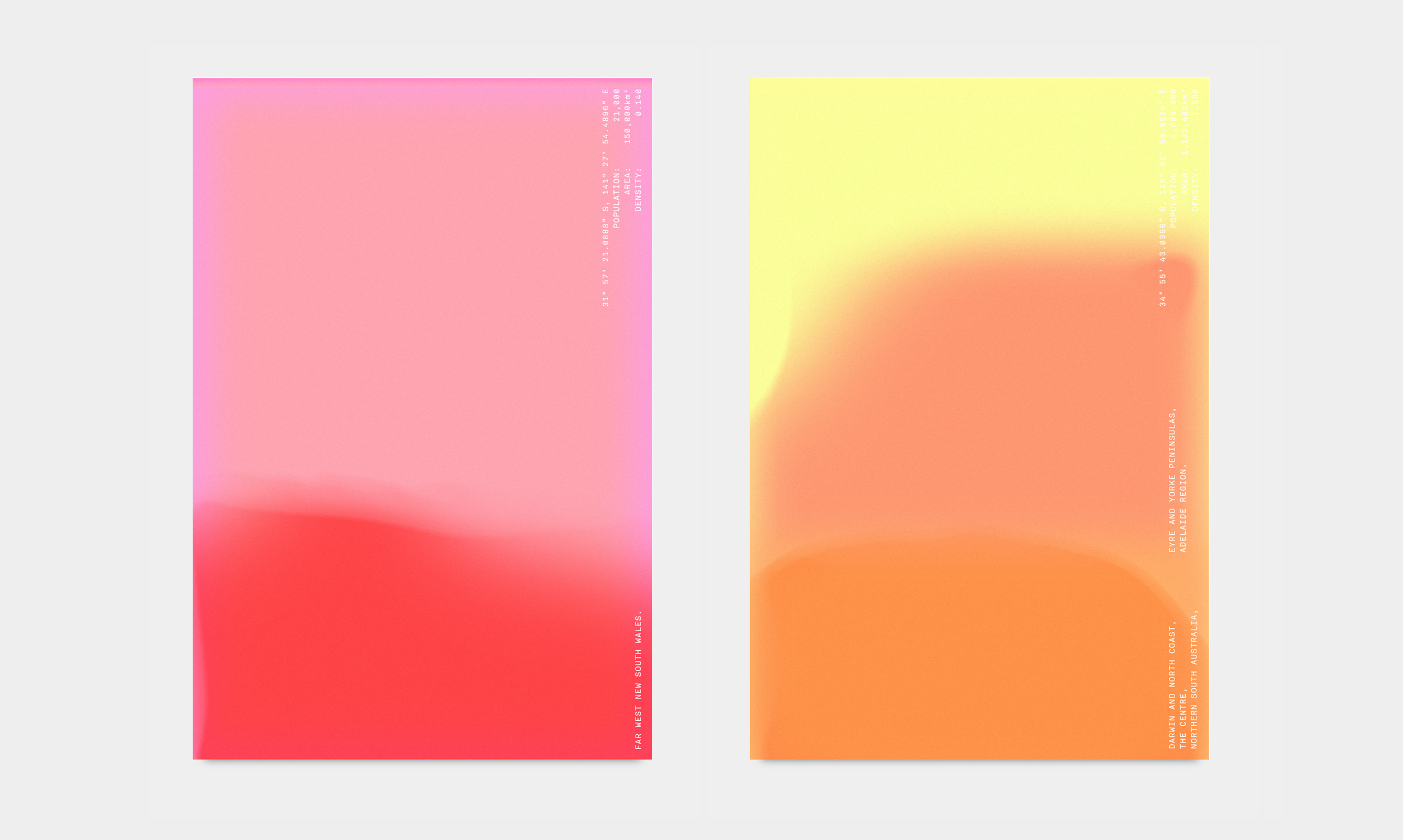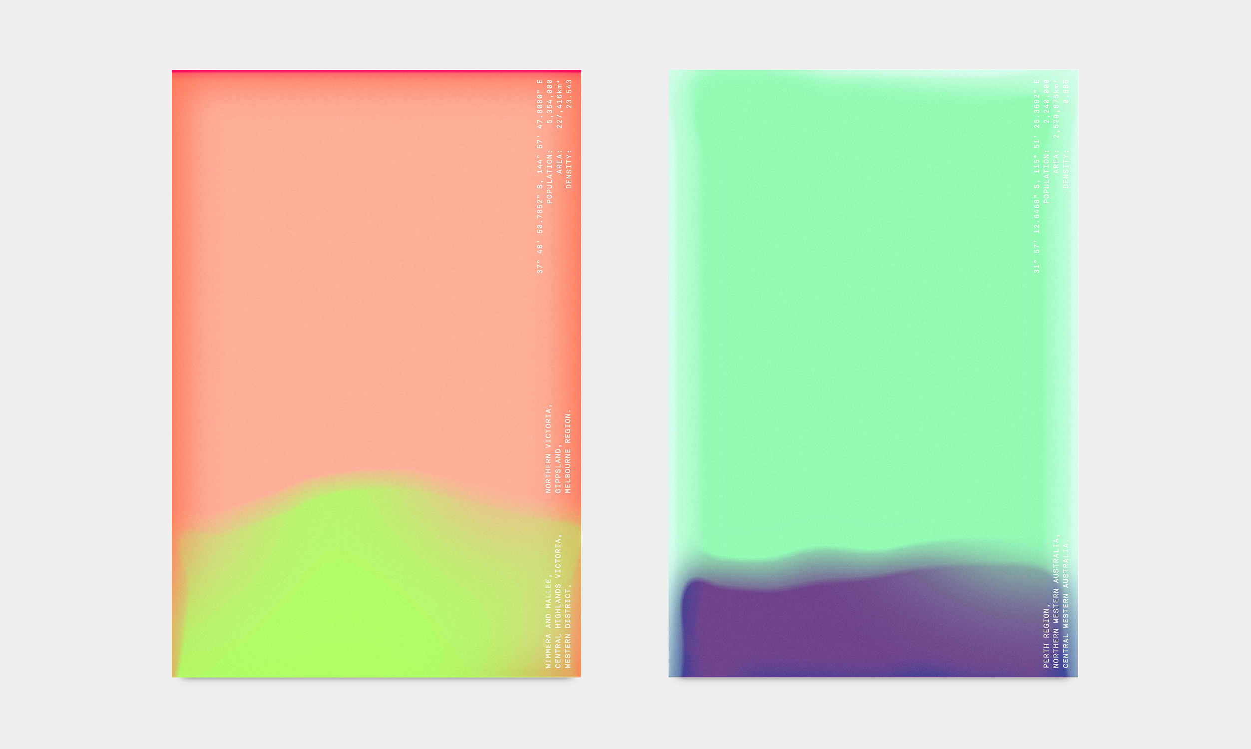 Using generative data, 'maps' are created where factors including population, area, density, longitude and latitude are turned into colours, saturation and strength of gradient to create alternative mapping outcomes.